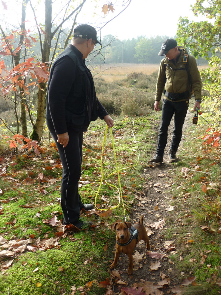 Op een traject van 500 meter met verschillende afslagen moest ik een voorwerp vinden en daarna baasje Eddy die zich verstopt had in het bos. Ik heb beide feilloos kunnen vinden. Mijn aandacht gaat toch ook wel uit naar andere lekkere geurtjes, zoals paardenmest, andere mensen, ander honden, en alles wat er maar te vinden is op die route. Het moest maar zo lekker niet ruiken hé?