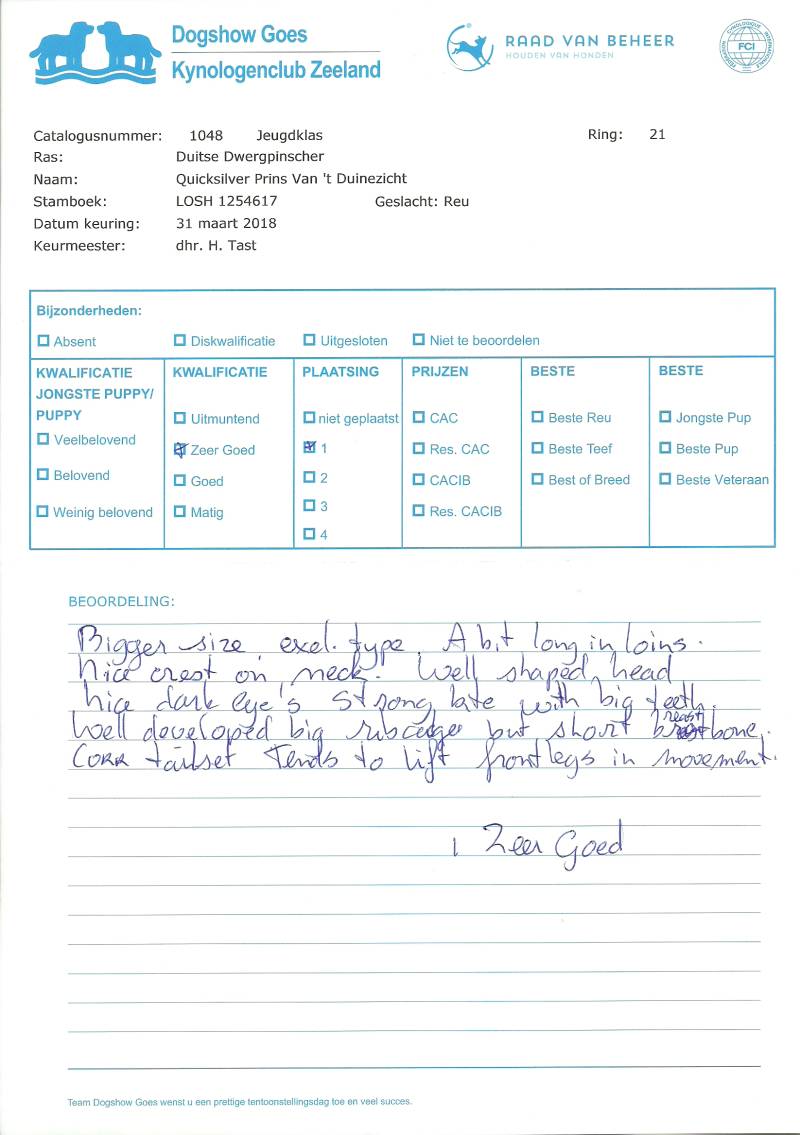 De keurmeester heeft mij wel een 1. Zeer Goed gegeven en daar waren mijn baasjes heel tevreden mee. Het was dan ook mijn eerste show in de jeugdklasse en ik had mij heel netjes gedragen op de keurtafel. Voor vrouwtje Rita was dit veel belangrijker dan het resultaat.