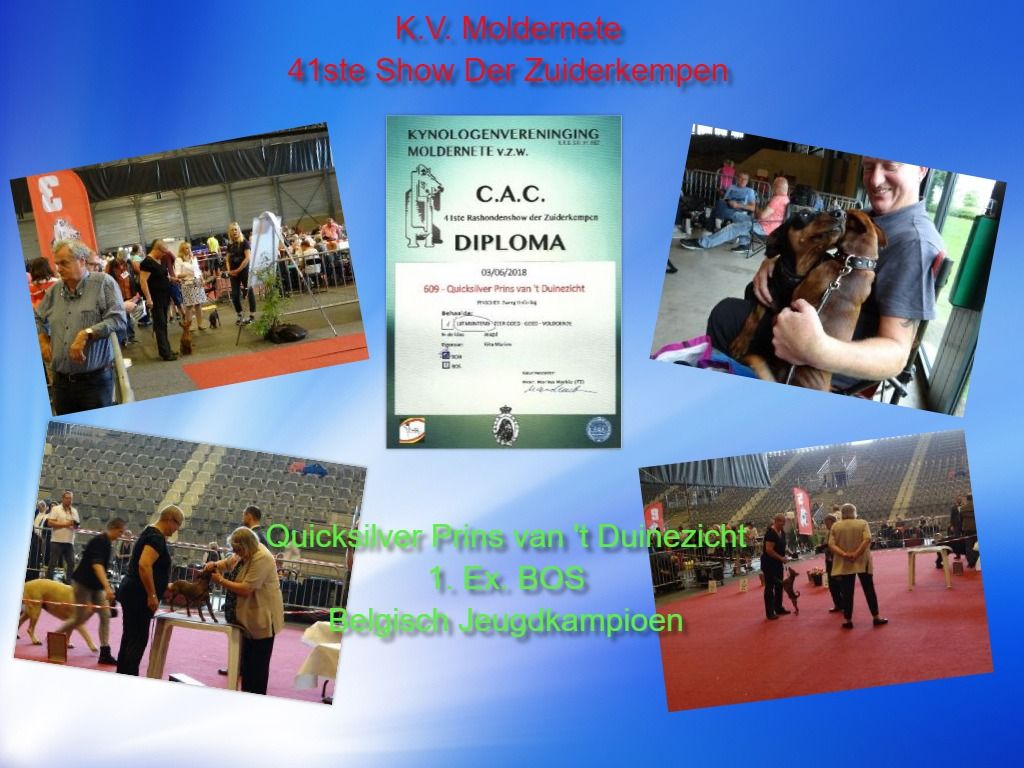Zoals in een eerder bericht vermeld ben ik naar de 41ste Show Der Zuiderkempen van K.V. Moldernete te Lommel geweest. Dit is de laatste show die ik voorlopig nog doe in België. Met drie maal 1.U. op rij, heb ik mijn titel als jeugdkampioen binnen. Eerder vertelde ik al dat show lopen niet zo mijn ding is. Ben ik blij met dit resultaat zeg. Mevr. Marina Markio (Fin) gaf mij een 1.U. waarmee ik met glans (3x 1.U.) het Belgisch jeugdkampioenschap binnenhaalde. Voor de BOB moest ik uitkomen tegen mijn zusje Quenelle van Brigitte. Zij won het omdat de keurmeester mij nogal ne ‘grote’ jongen vond. Dikke proficiat zusje Quennelle! Nog twee shows te gaan in Nederland en dan zit het er voorlopig op voor mij.