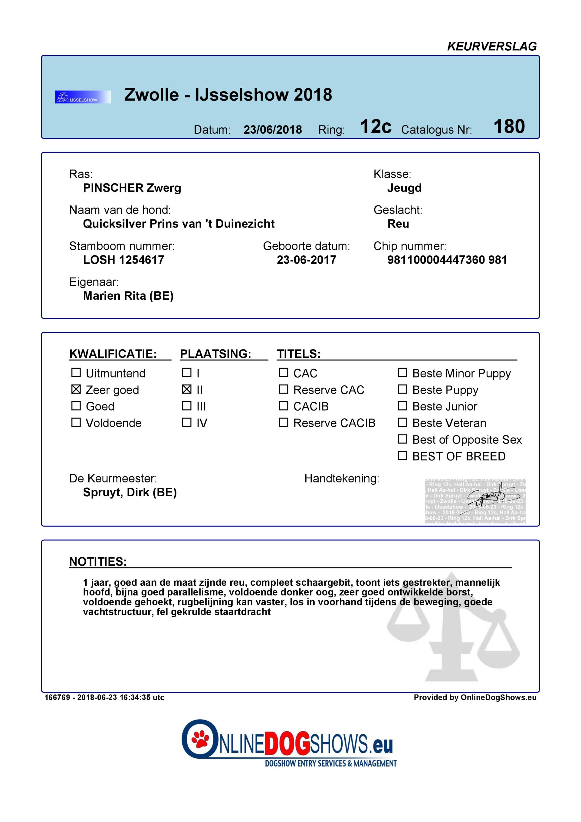 We zijn met een povere 2.Z.G. naar huis gekomen. Waar keurmeesters Theo Leenen en keurmeester M. Nuijen mij een tophondje vonden vond keurmeester Mr. Dirk Spruyt mij maar een middelmaatje. Zijn motivatie was dat ik met mijn rechtervoorpoot niet altijd op de grond steun. Waardoor hij dacht dat ik een mankementje had in mijn rechterpols.