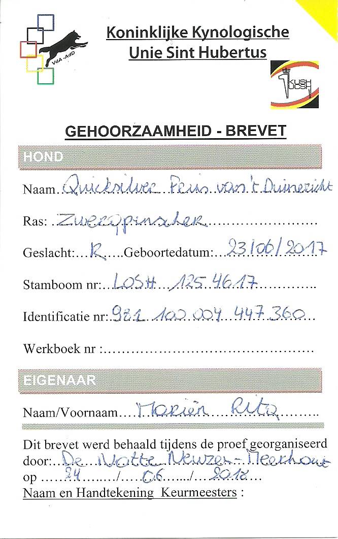 Vrouwtje Rita heeft mij voor 3 brevetten ingeschreven. Dat was niet nodig geweest want ik ben vandaag met 96/100 geëindigd. Met dank aan keurmeesters Daniel Daems – De Roeck C. – Moonen R. en Verherstraeten A.