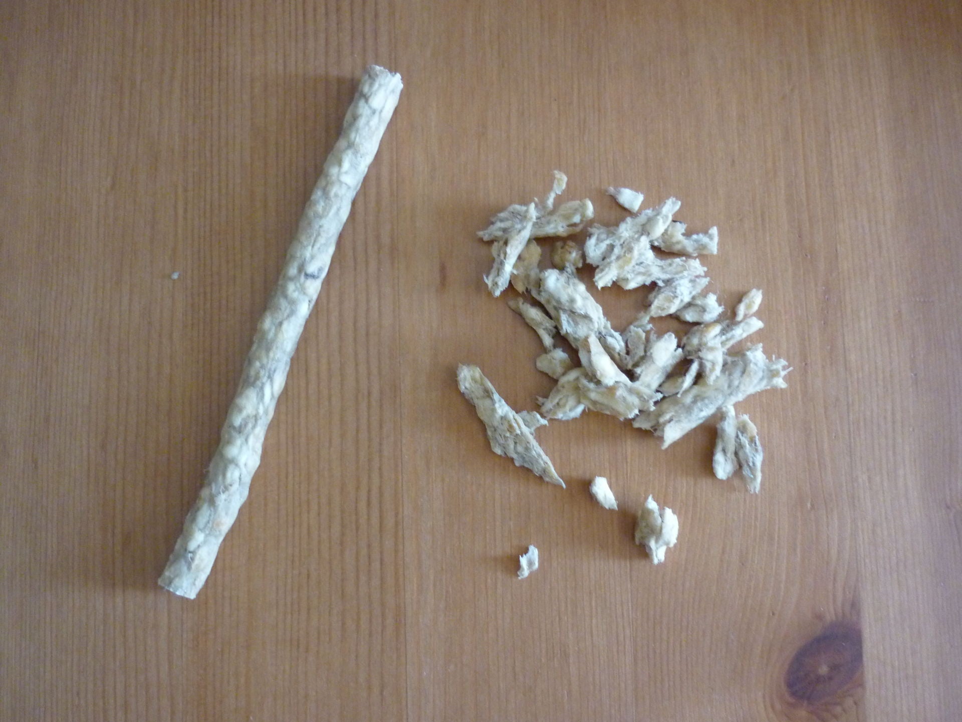 Hondentraktatie? De foto’s, voor en na, ik heb de stokjes tot pulp gereduceerd. Dat is toch niks om op te eten! Bweikes!!!