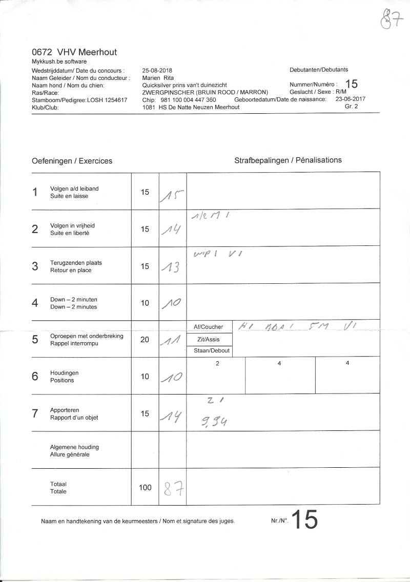 Ik ben gisteren op wedstrijd geweest bij VHV te Meerhout en daar heb ik 87 puntjes op 100 verdiend en daar waren ik en mijn baasjes zeer tevreden mee.