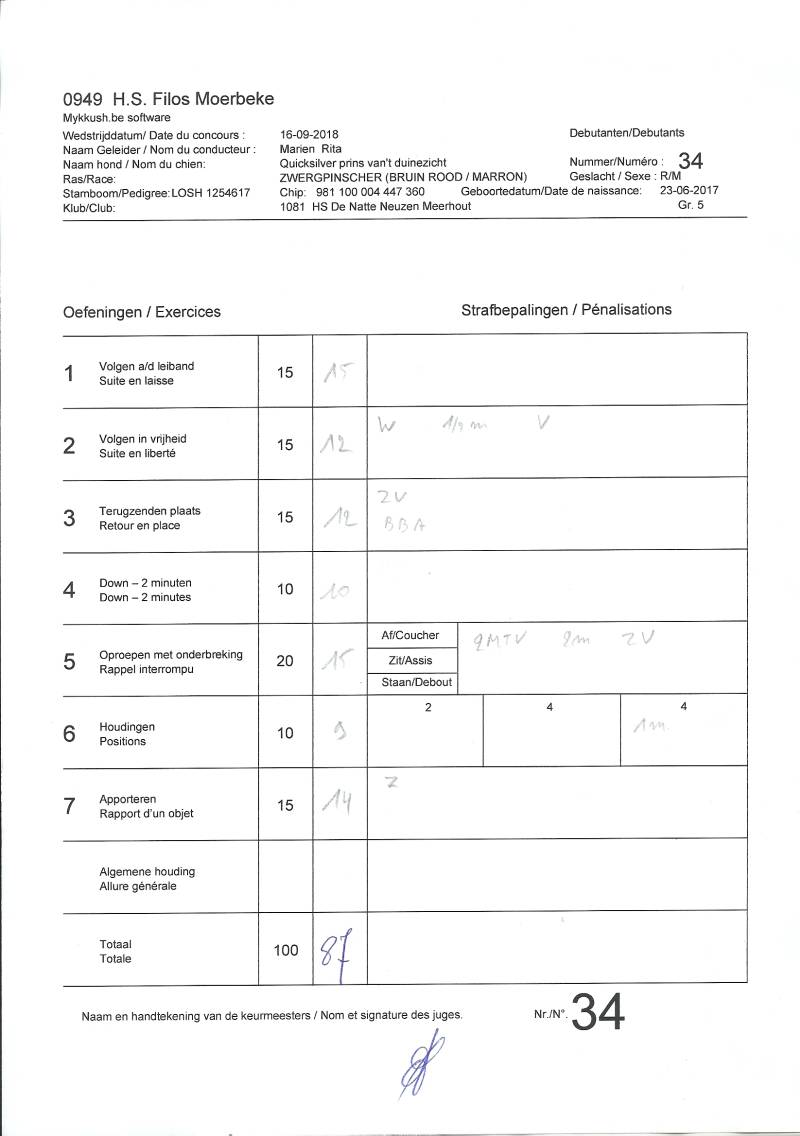 Gisteren ben ik op wedstrijd geweest bij HS Filos te Moerbeke Waas, daar heb ik een resultaat van 87 op 100 gescoord. Nogal wat mensen vertelden mijn baasjes dat het een strenge keurmeester was. Ik en mijn baasjes vinden dat niet erg. Dan weet je tenminste wat je echt waard bent.