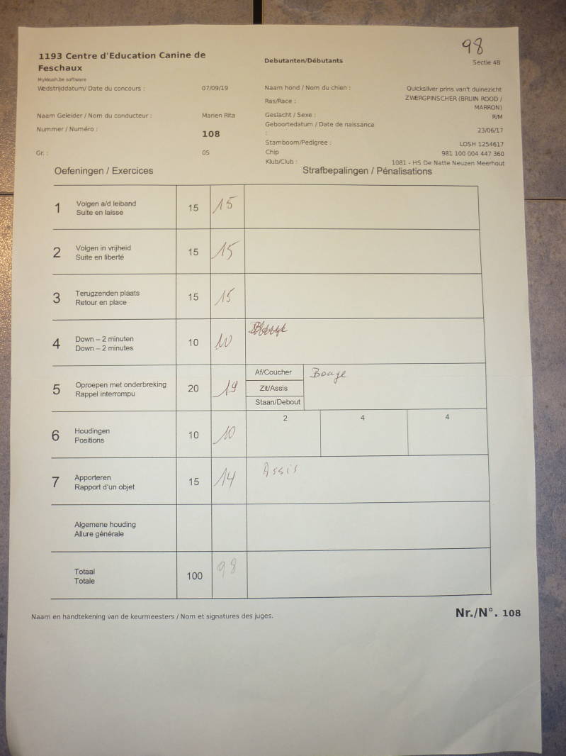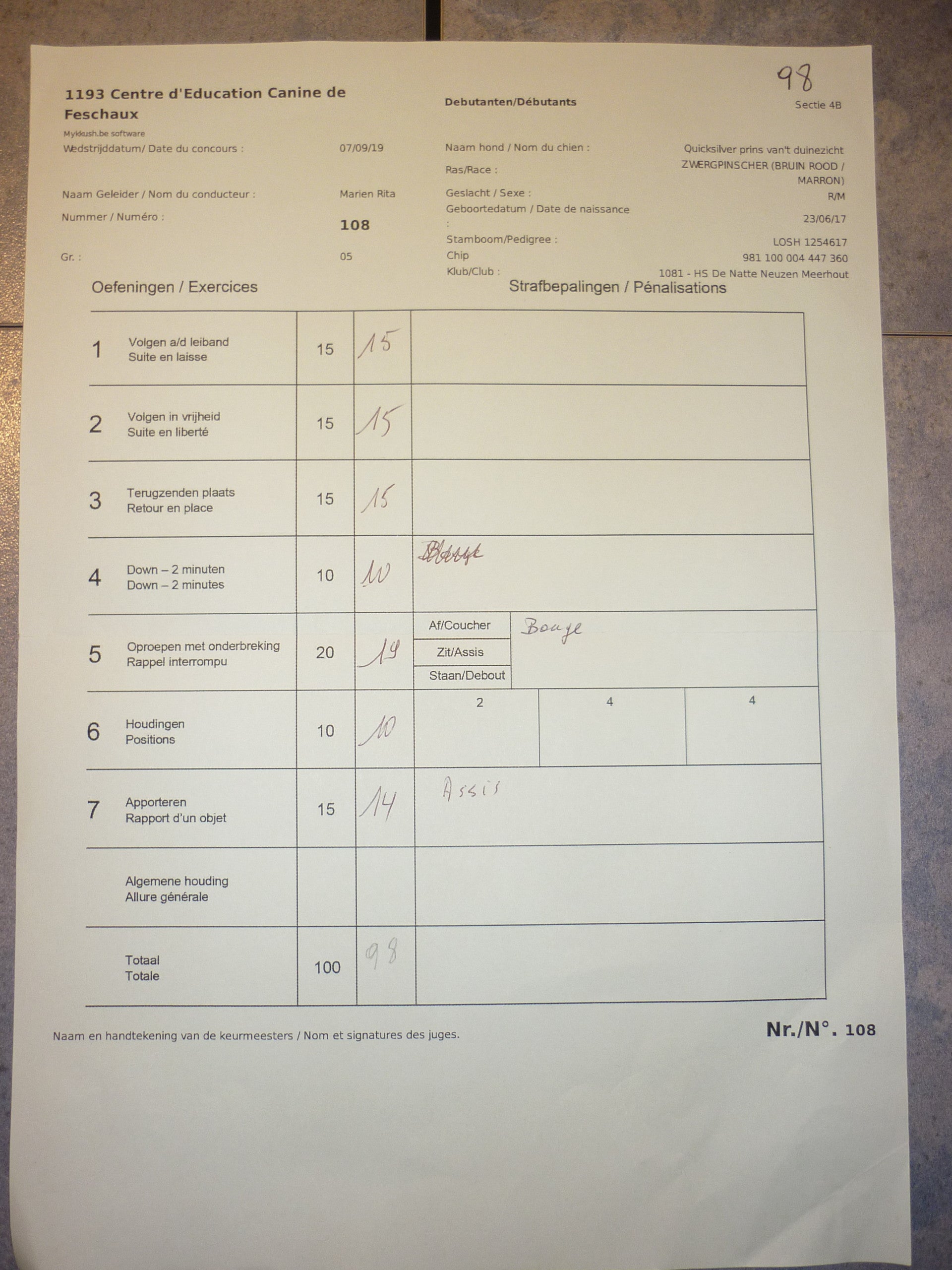 Wauw, vandaag ben ik in mijn nopjes en mijn baasjes nog meer. Tijdens de wedstrijd te Feschaux in de provincie Namen behaalde ik met 98/100 een verdiende tweede plaats samen met een Duitse herder, Qatar genoemd.