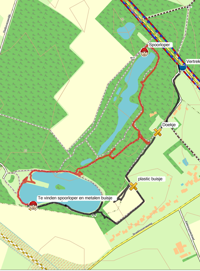 We waren alle drie benieuwd of ik het nog zou kunnen. En wat blijkt? Dat wat ik van jongs af aan geleerd heb zit er in gebakken om nooit meer te verdwijnen. Op het kaartje, de zwarte lijn, een track van 1.5 km. Aan het vlaggetje is het vertrek en onderweg vond ik ook nog wat voorwerpen die de spoorloper verloren had, een lapje, een plastic en een metalen buisje. Dan moest ik ook nog de spoorloper vinden. Dit alles handelde ik af op ongeveer 20 minuutjes.