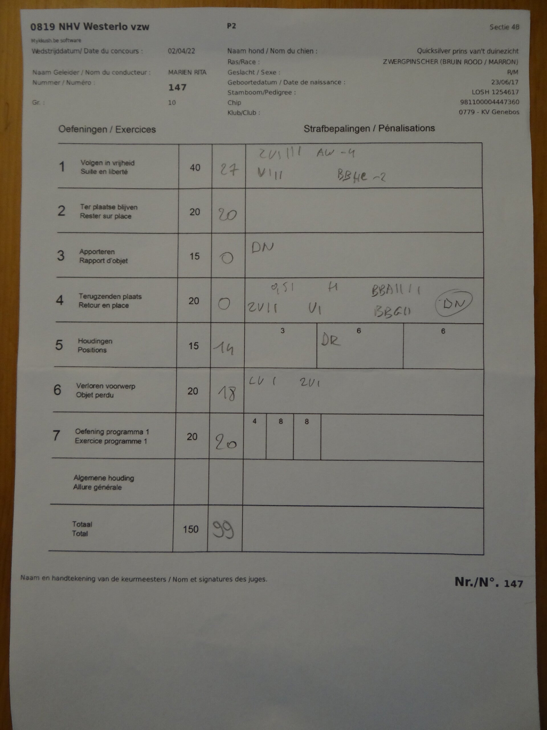 Wat mezelf betreft: zaterdag heb ik spijtig genoeg mijn baasjes eens ter orde moeten roepen en dat kan alleen maar met de puntjes. 99/150 daar waren ze van onder de indruk. En dat was mijn bedoeling. Ze waren de laatste weken zo druk met de caravan dat ze mij vergeten waren. Ik train graag en dat schoot er over. Dan heb ik, via mijn lage punten, maar eens laten weten dat ik niet akkoord was met deze gang van zaken. Als statement kan dat wel tellen.