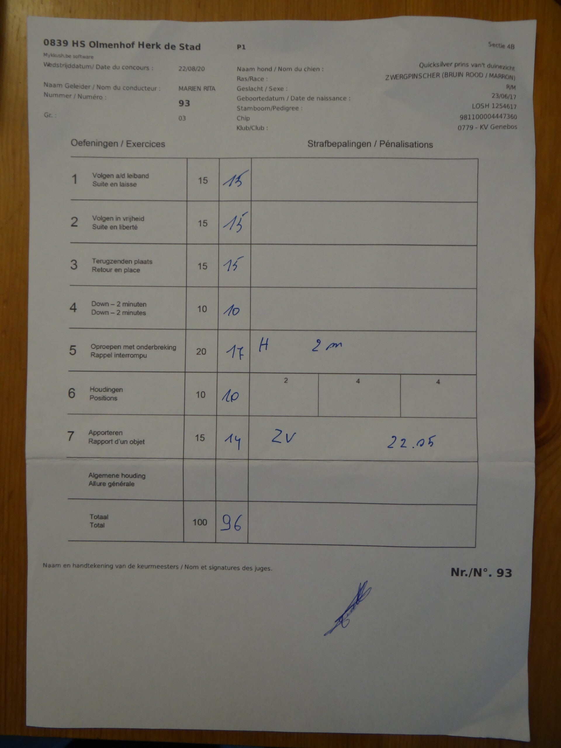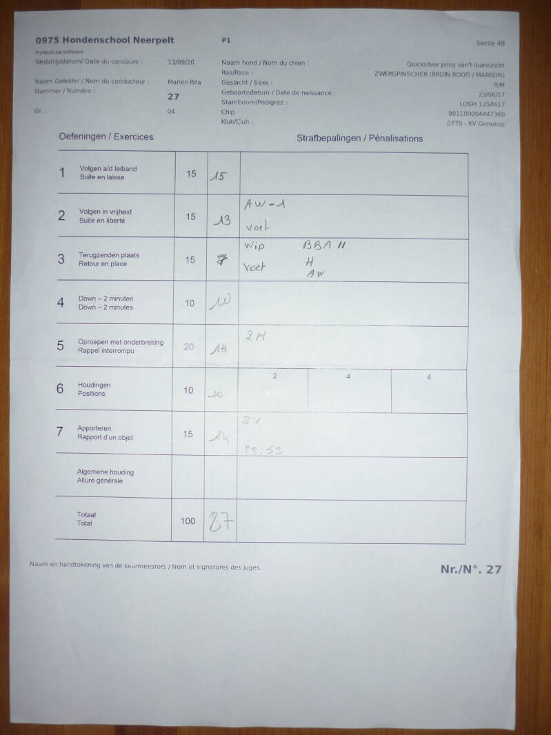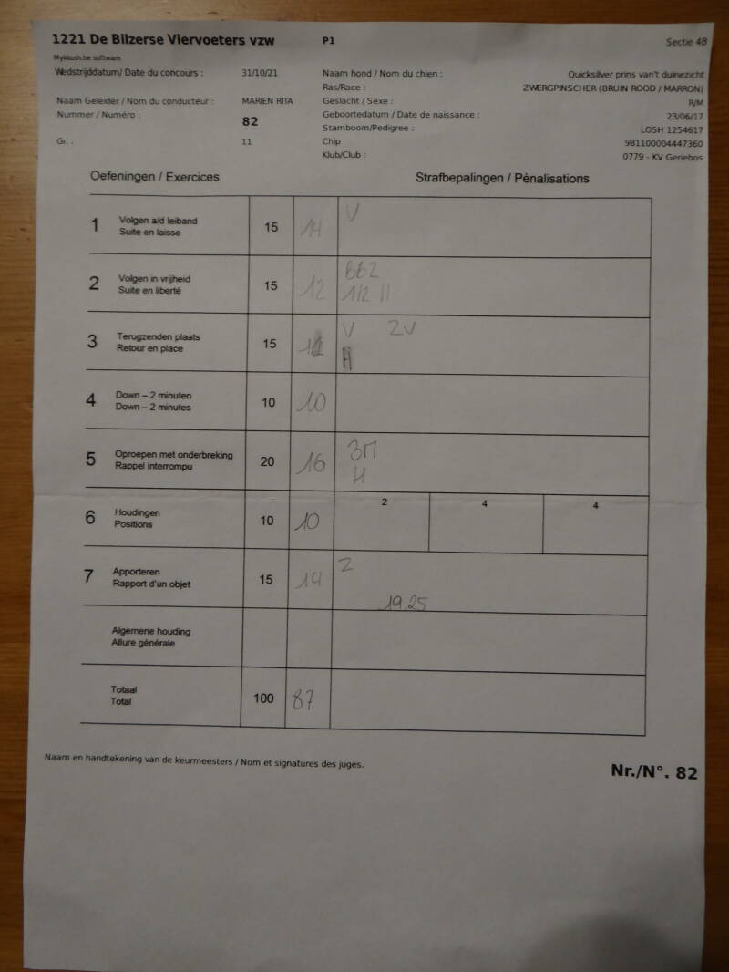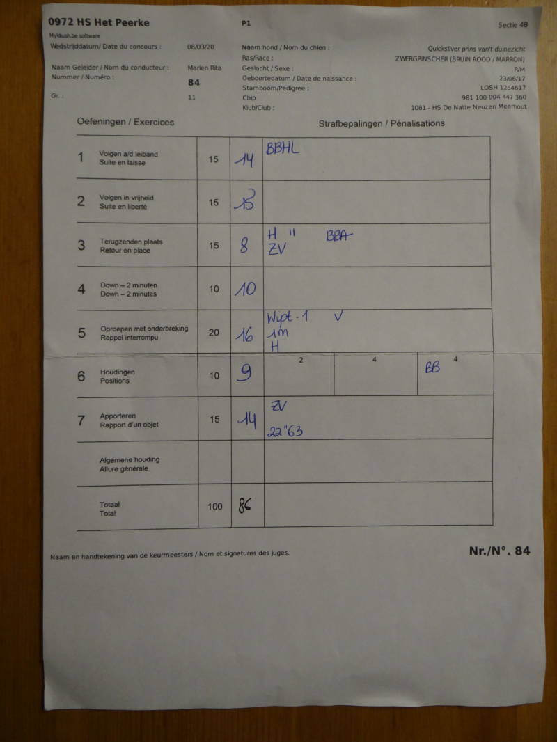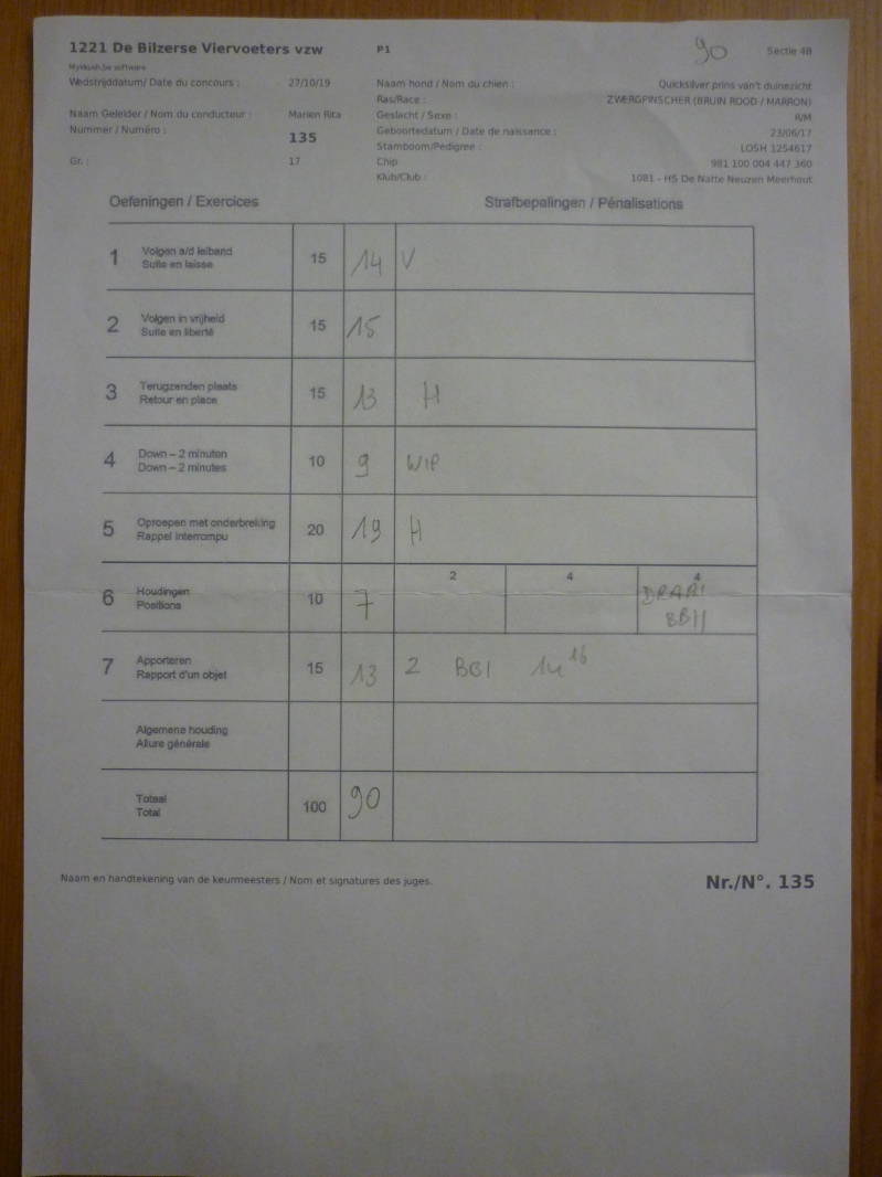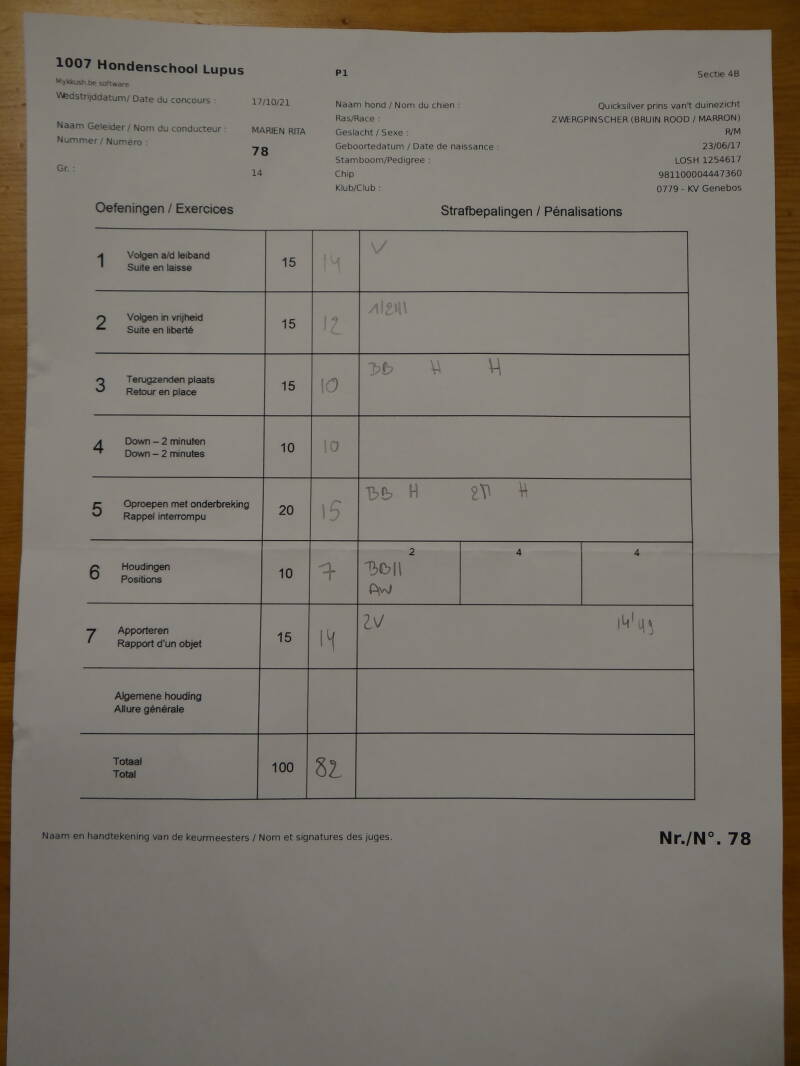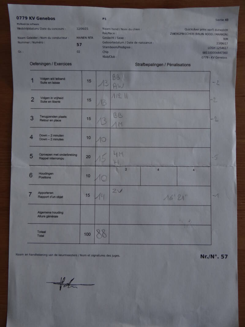 *For this competition in GP 1 at DS ''Club Canin Bertrix'' at Bertrix, Prins achieved a score of 90/100