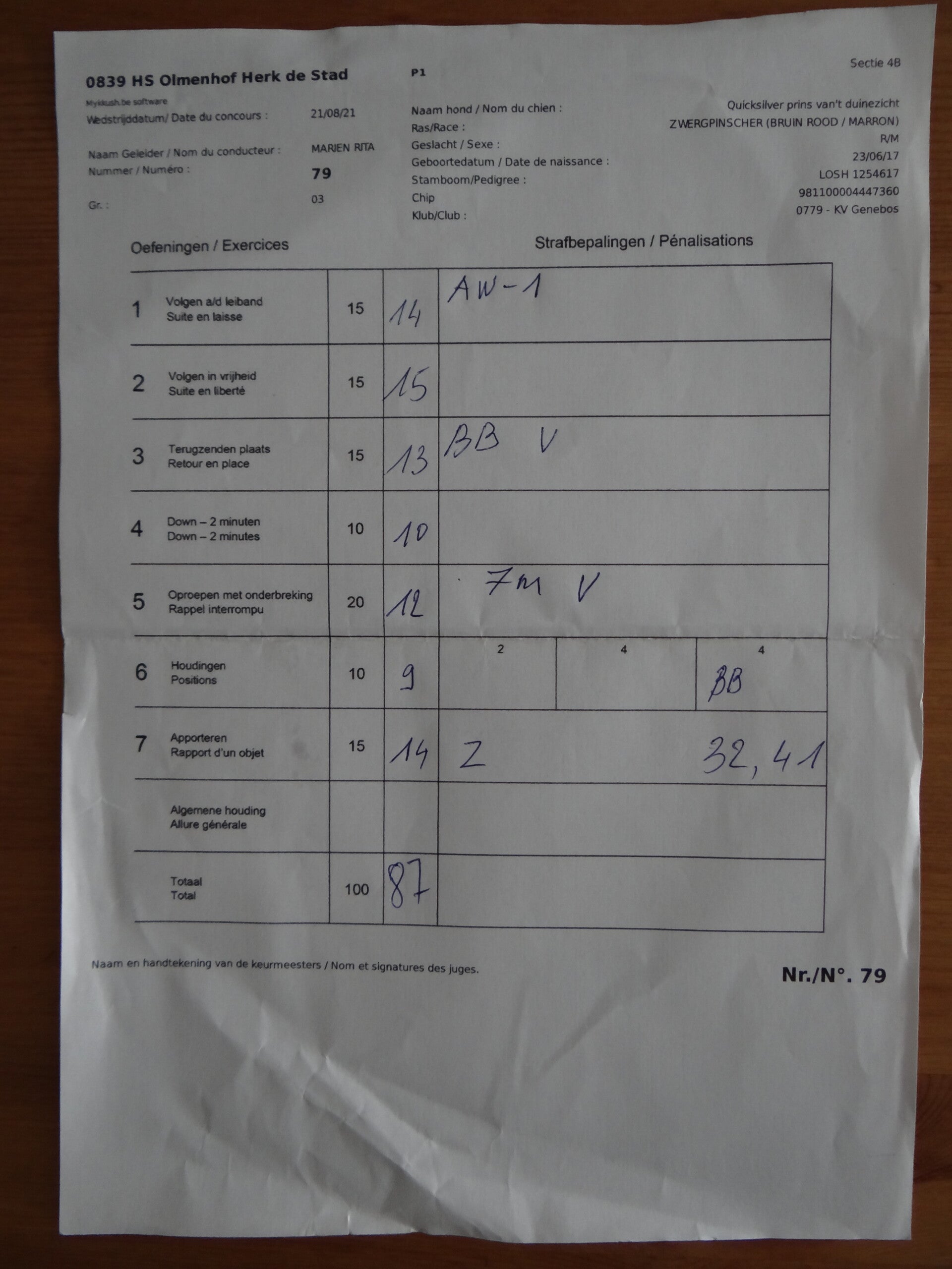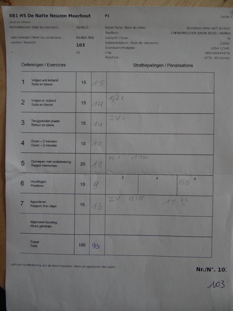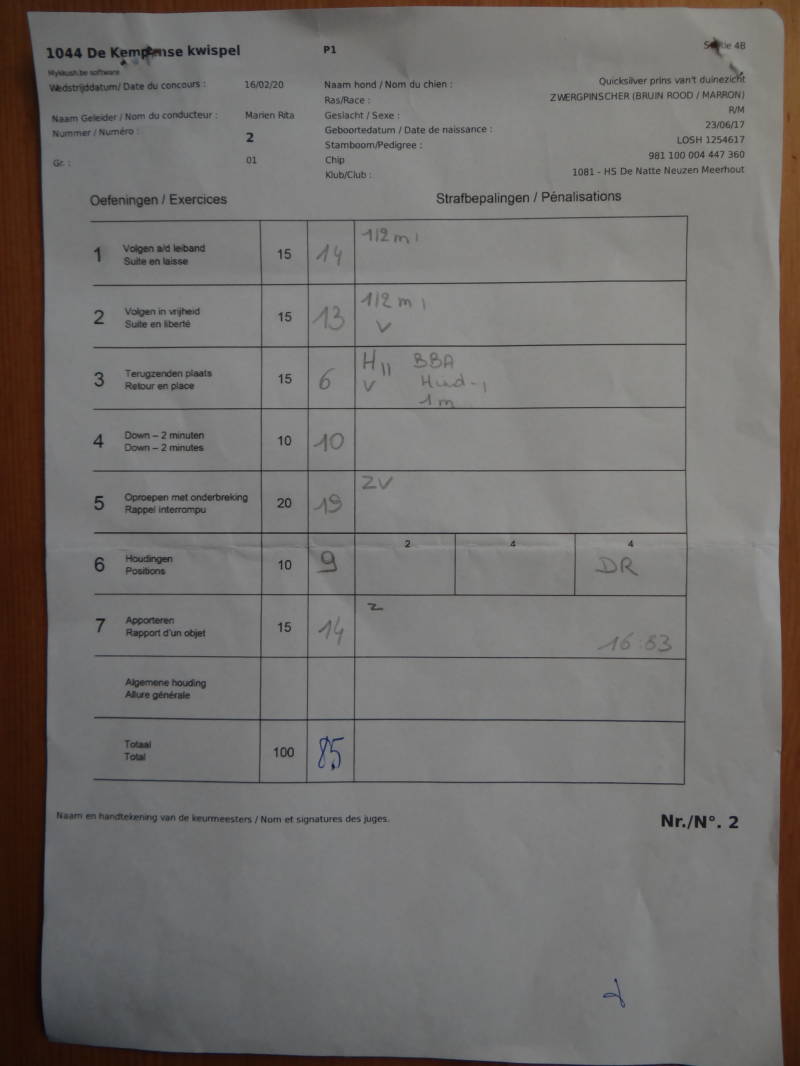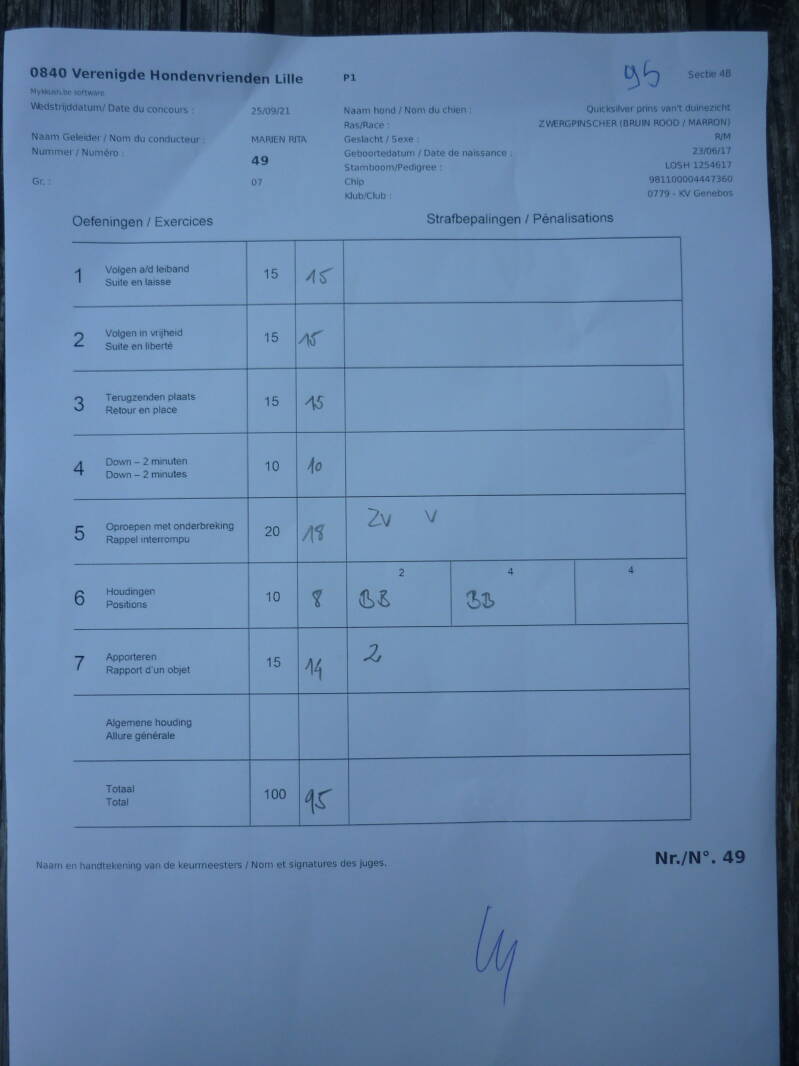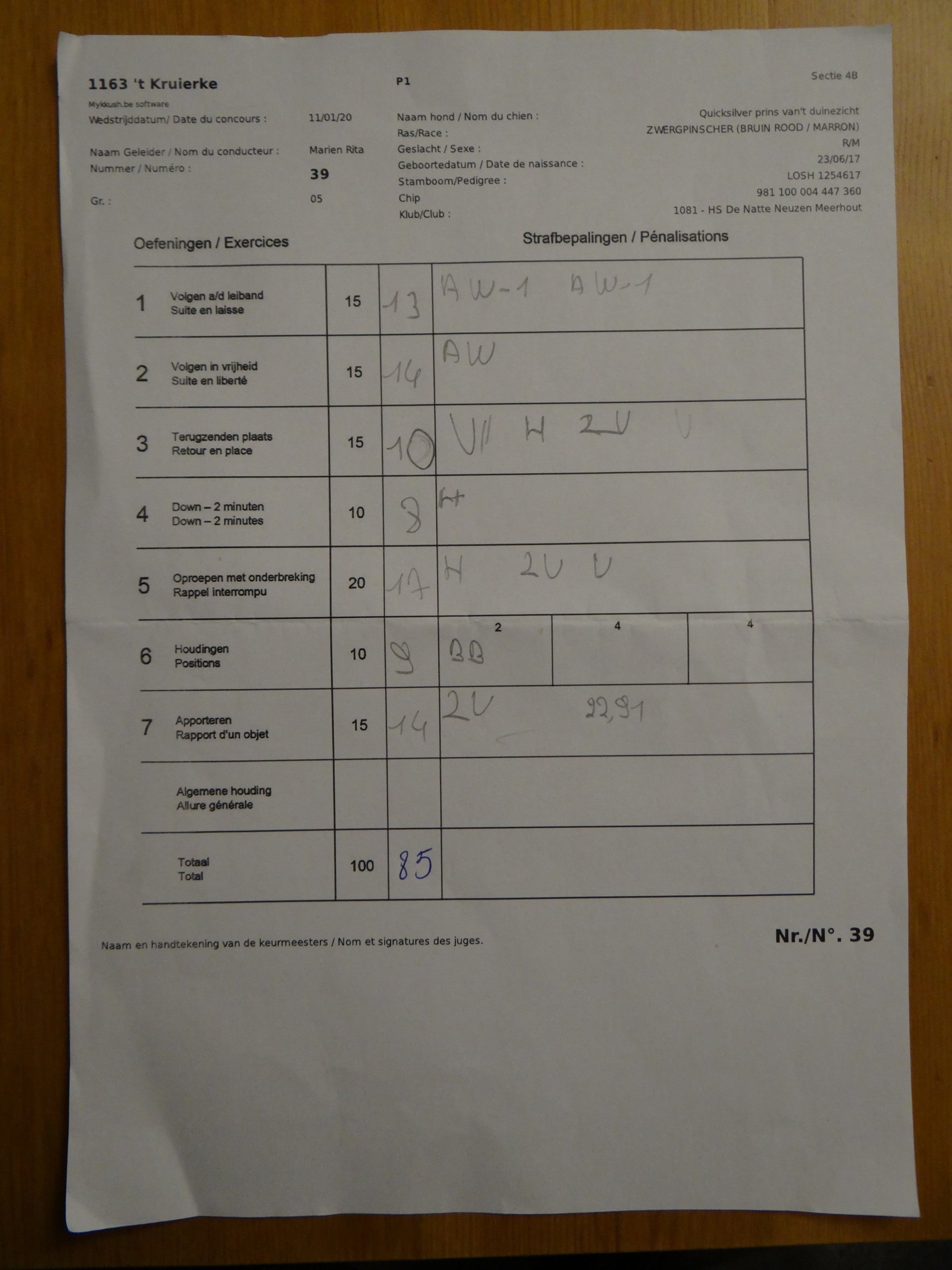 *For this competition in GP 1 at DS ''Club Canin Bertrix'' at Bertrix, Prins achieved a score of 90/100