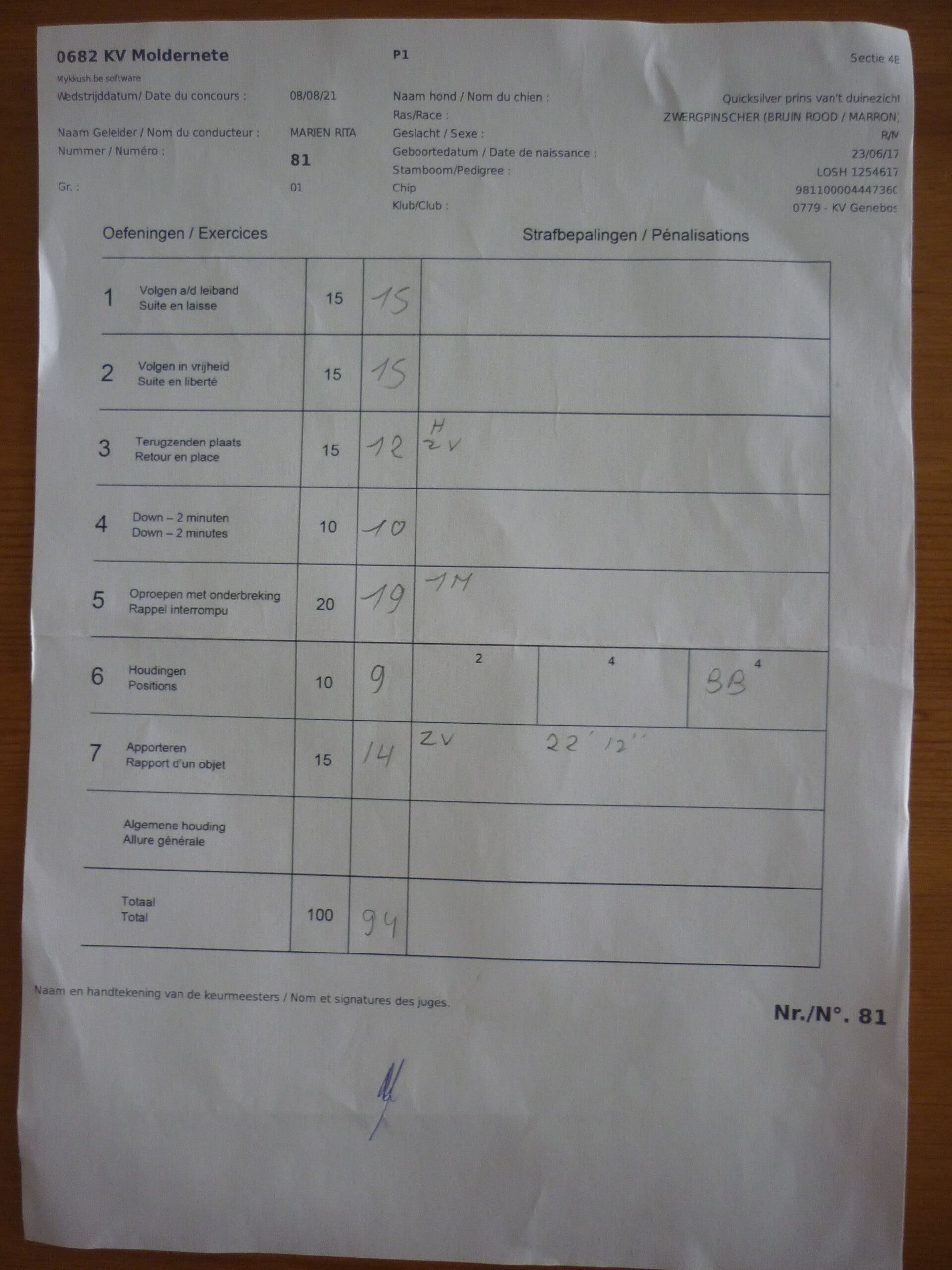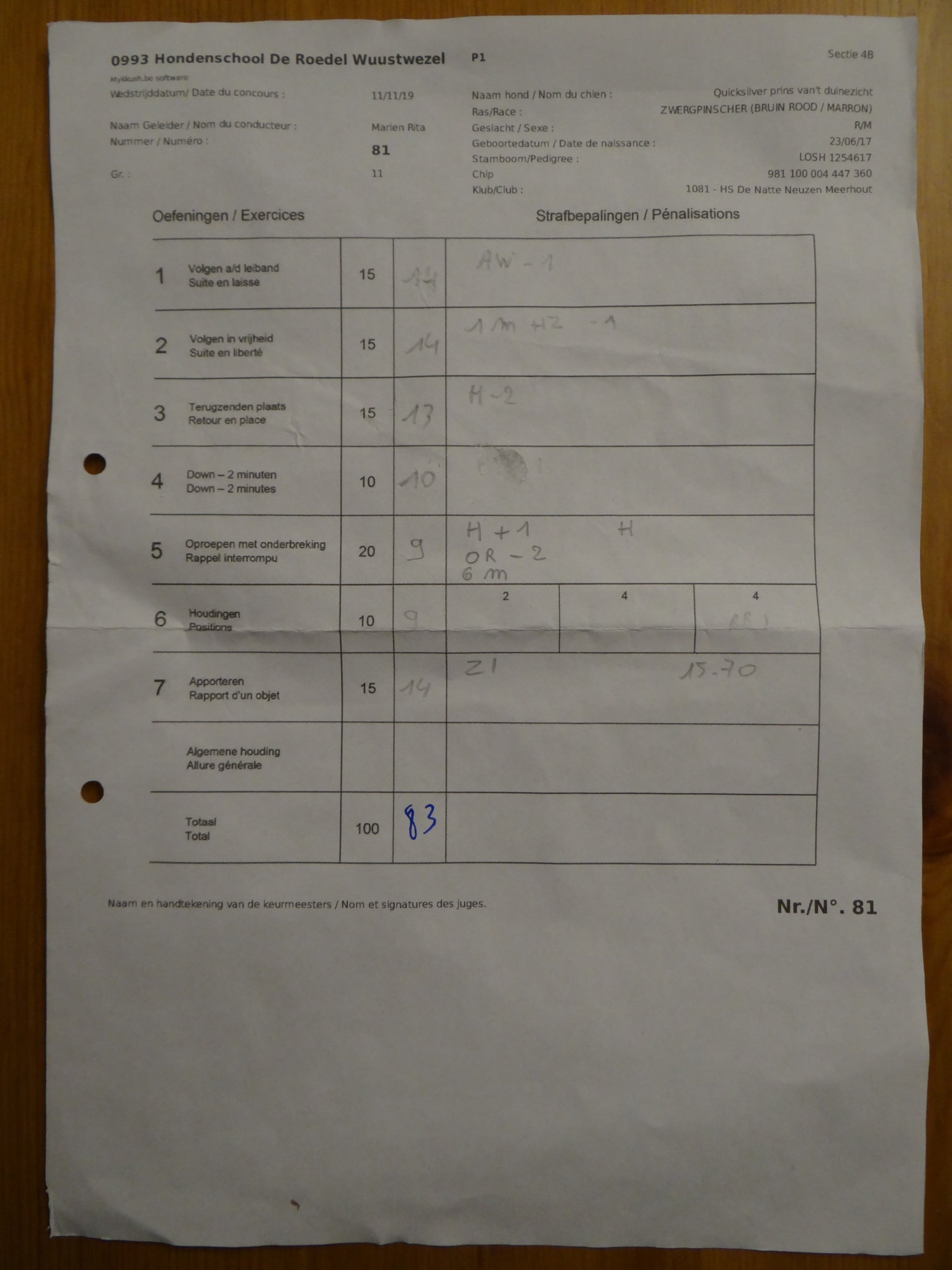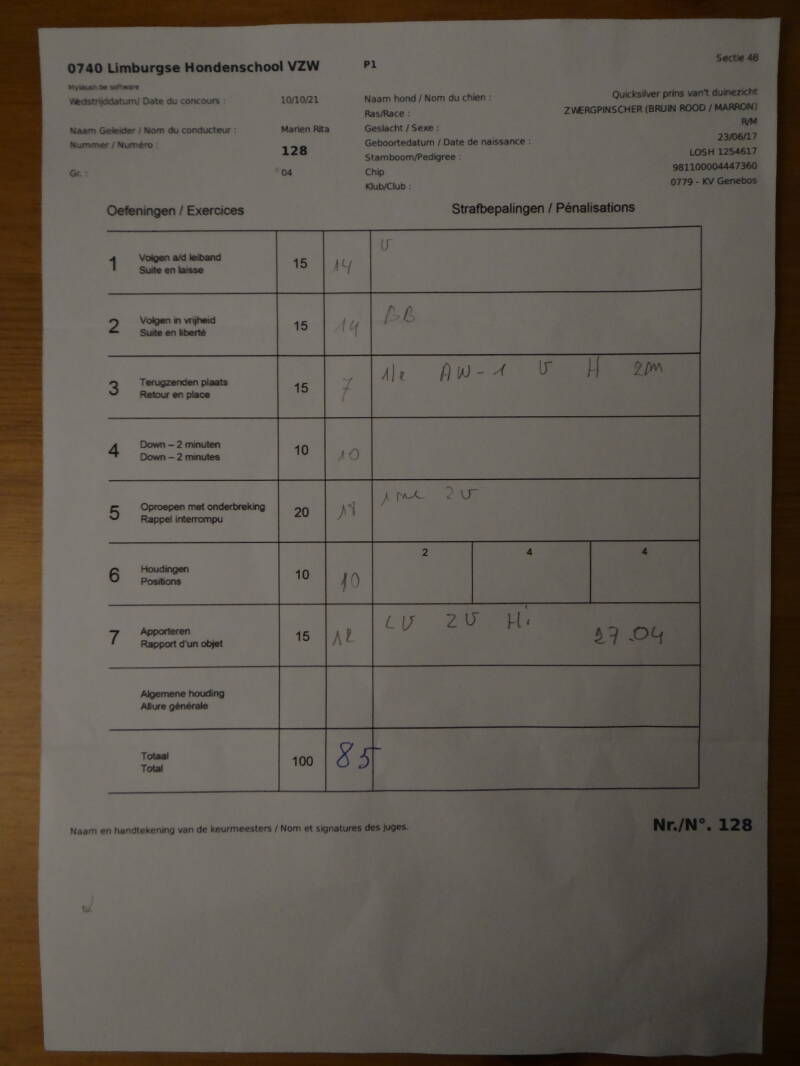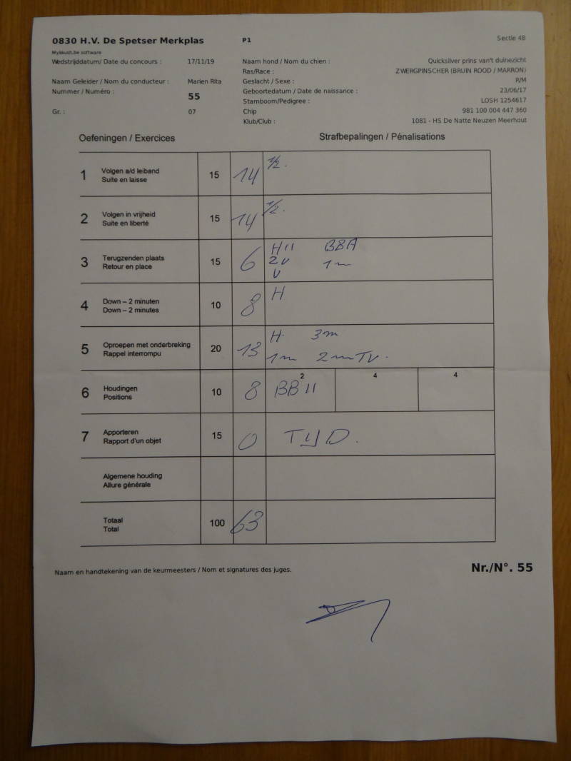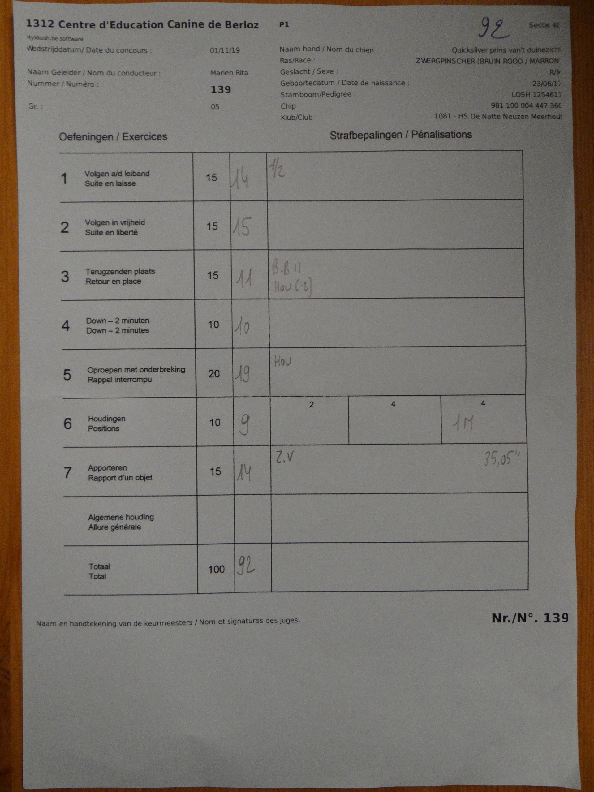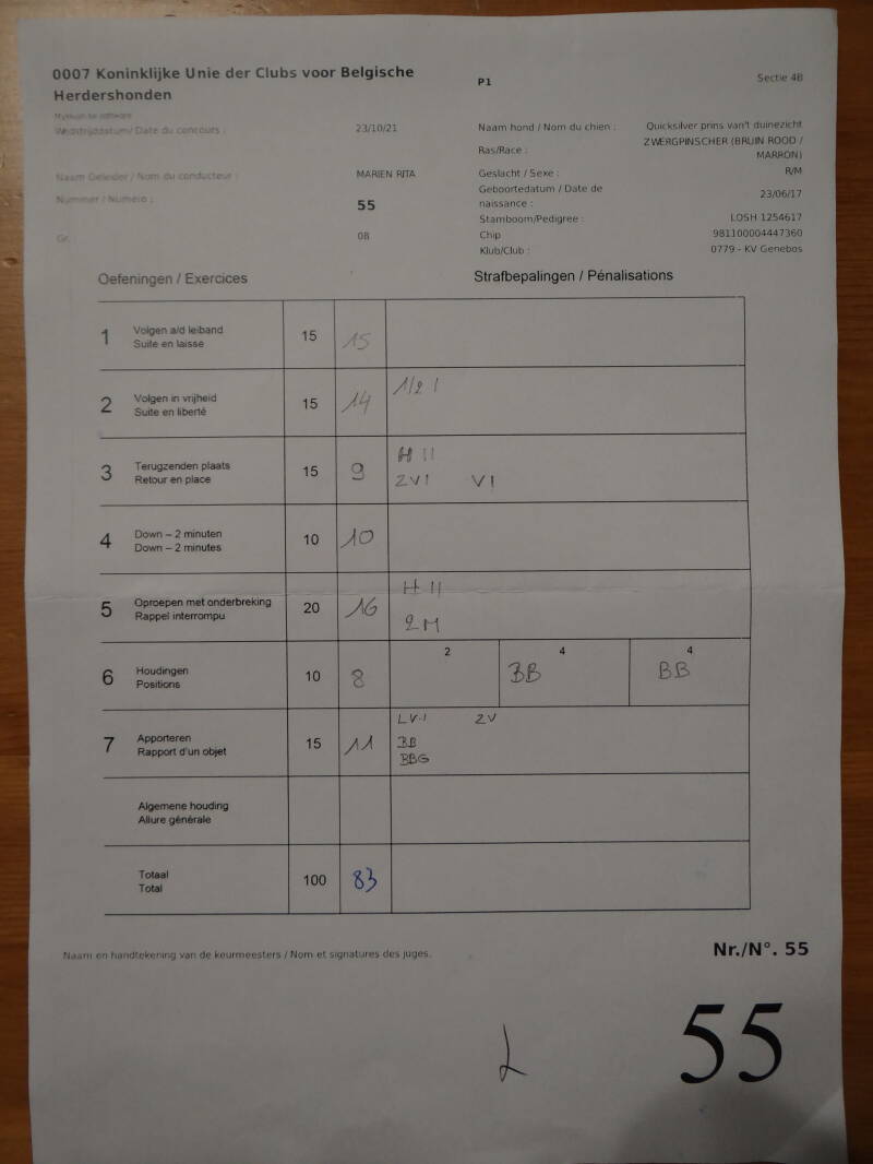 *For this competition in GP 1 at DS ''Club Canin Bertrix'' at Bertrix, Prins achieved a score of 90/100