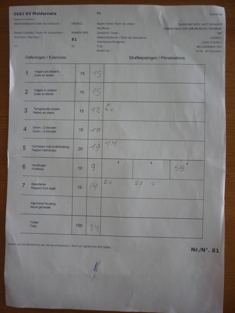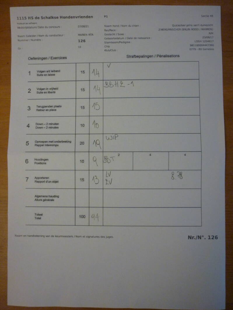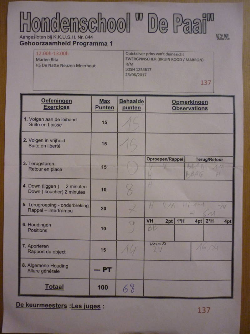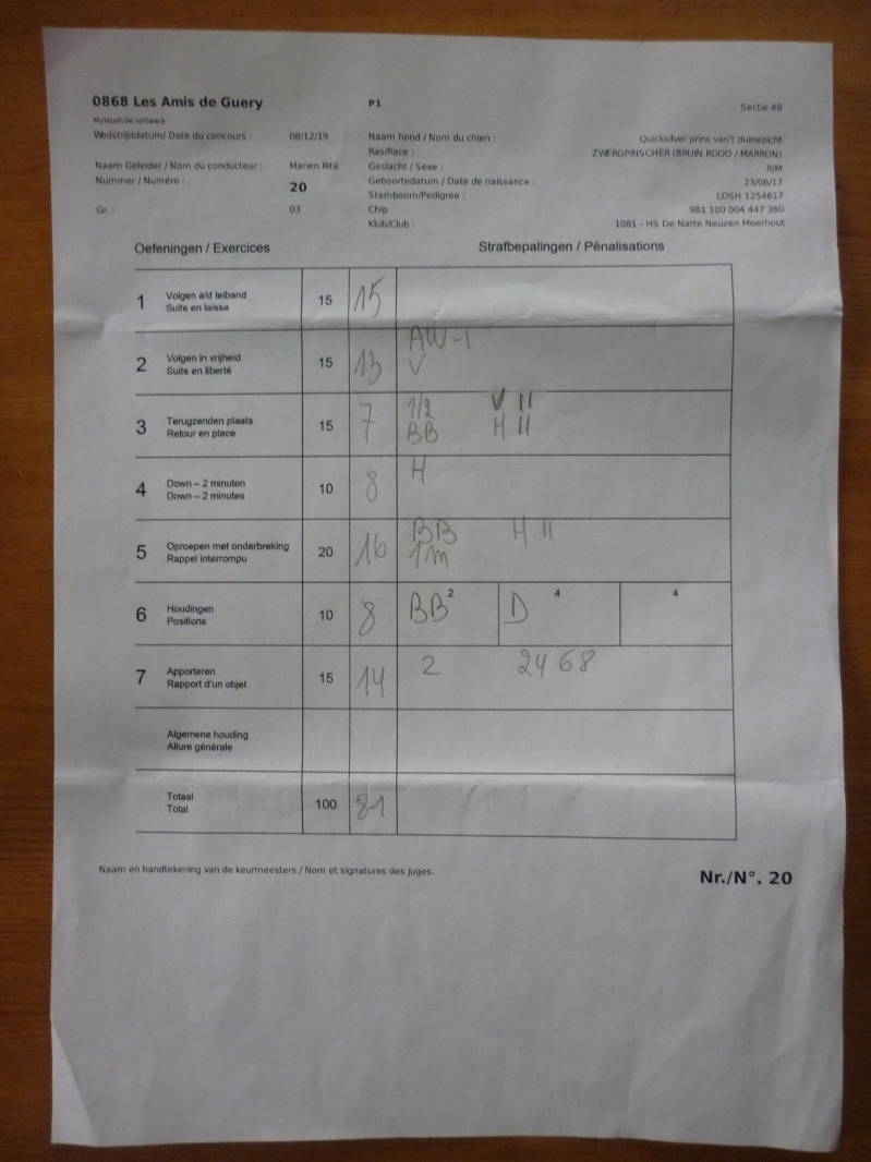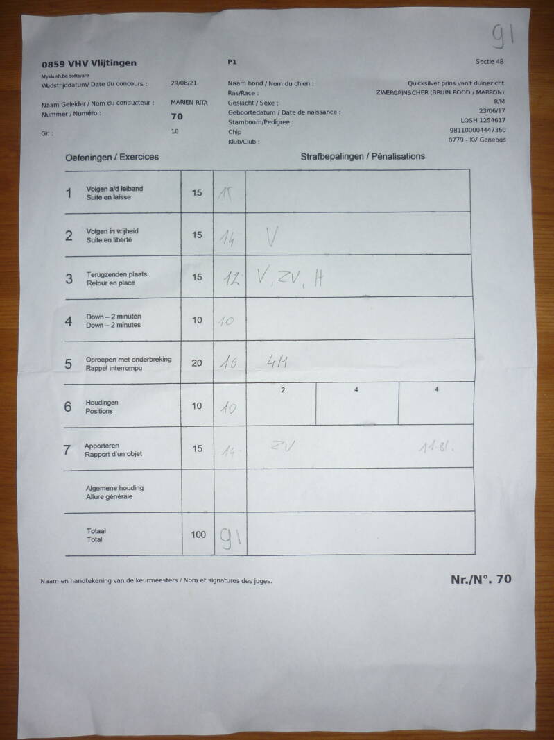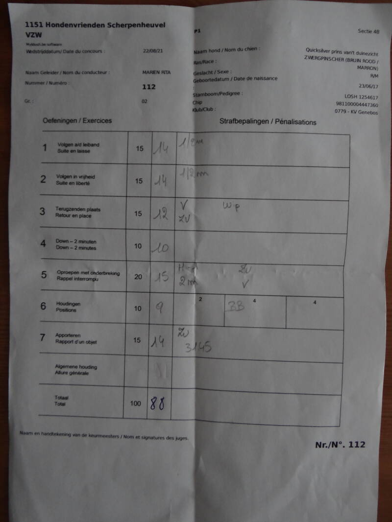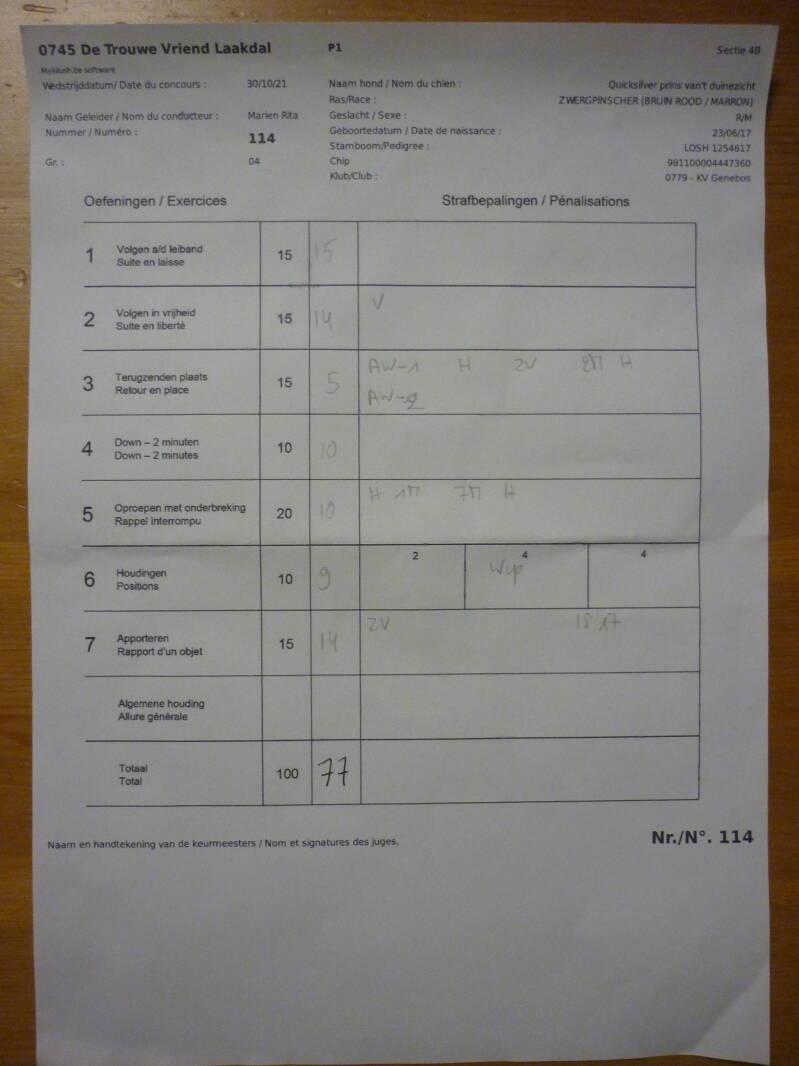 *For this competition in GP 1 at DS ''Club Canin Bertrix'' at Bertrix, Prins achieved a score of 90/100