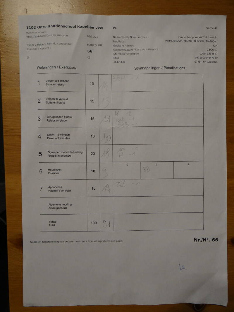 *For this competition in GP 1 at DS ''Onze Hondenschool'' at Kapellen, Prins achieved a score of 91/100