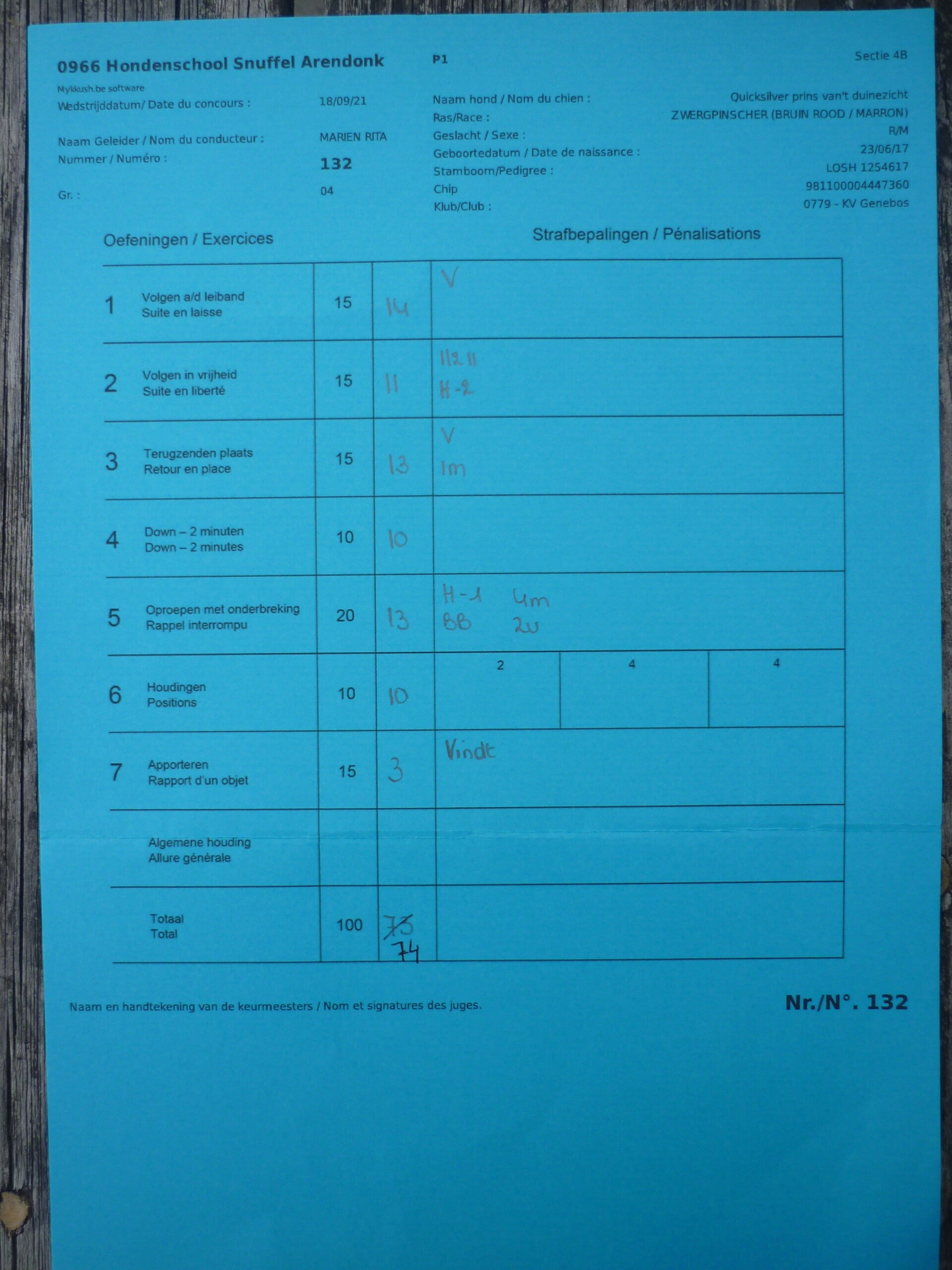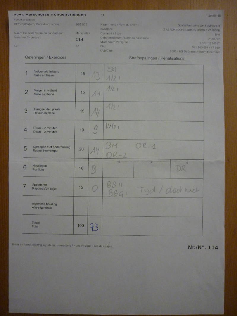 *For this competition in GP 1 at DS 'Aarschotse Hondenvrienden' at Aarschot, Prins achieved a score of 73/100