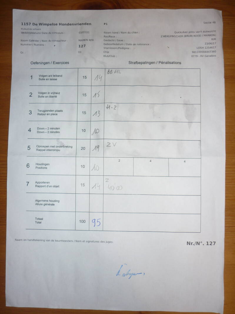 *For this competition in GP 1 at DS ''De Wimpelse Hondenvrienden'' at Wiekevorst, Prins achieved a score of 95/100