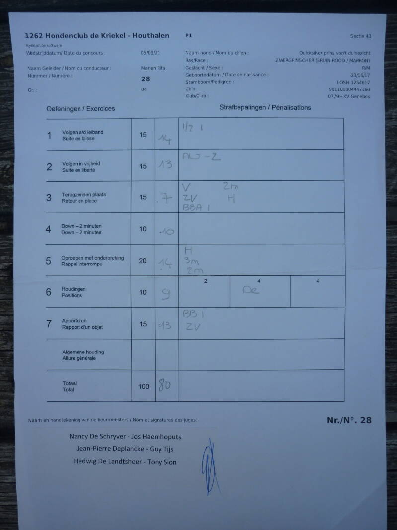*For this competition in GP 1 at DS ''Dog Training Center'' at Tongeren, Prins achieved a score of 80/100
