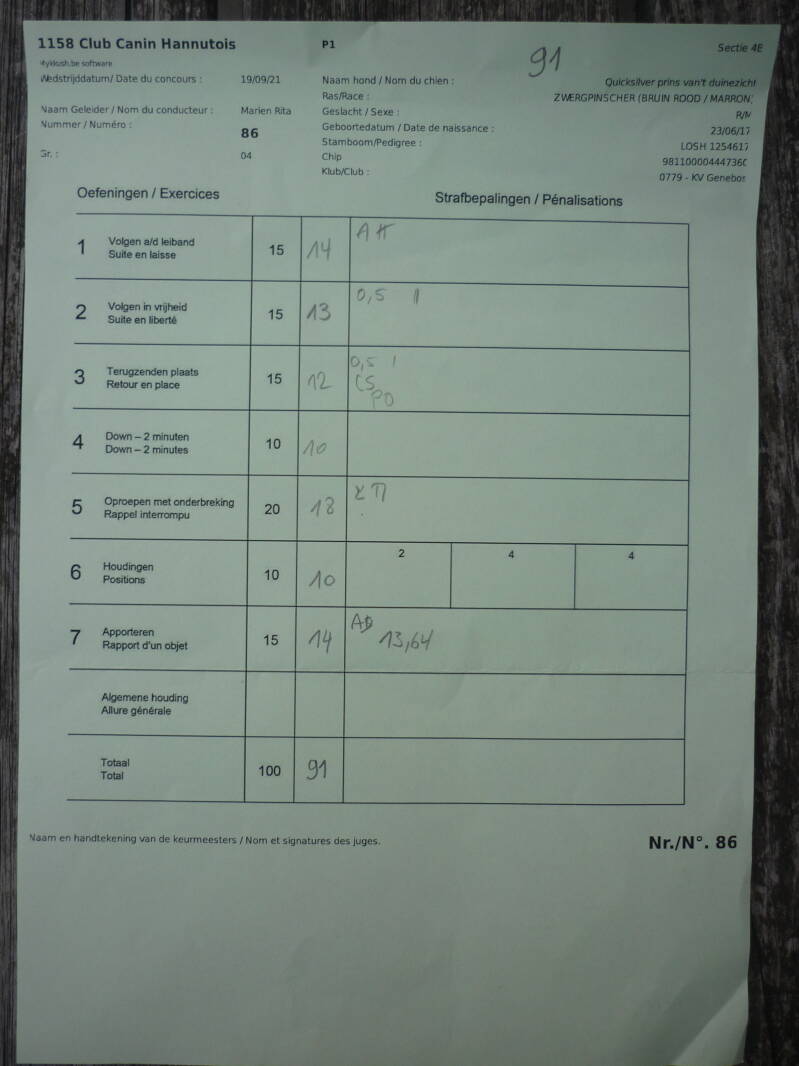 *For this competition in GP 1 at DS ''Club Canin Hannutois'' at Hannut , Prins achieved a score of 91/100