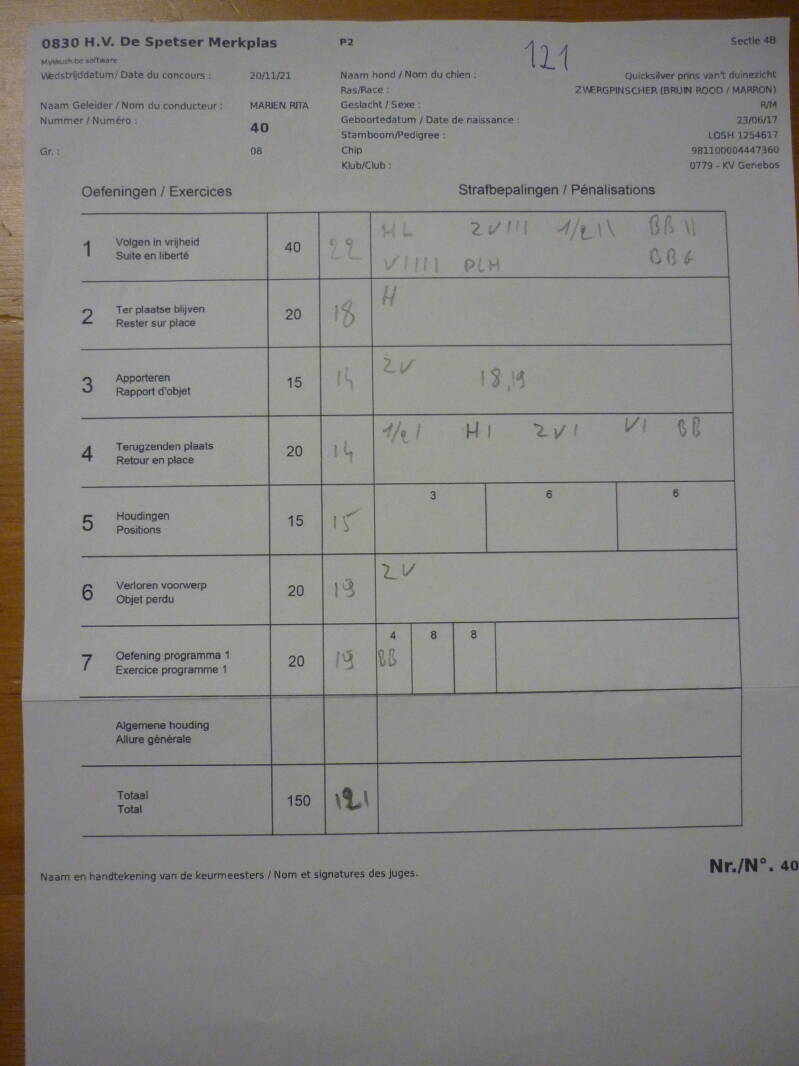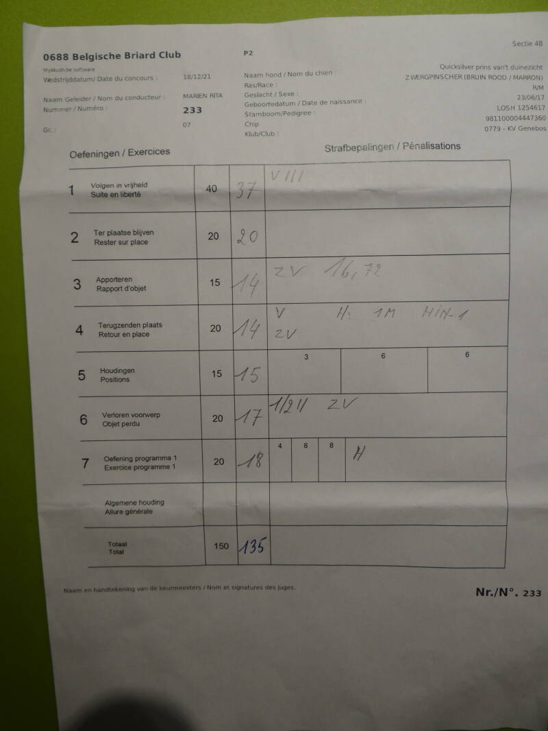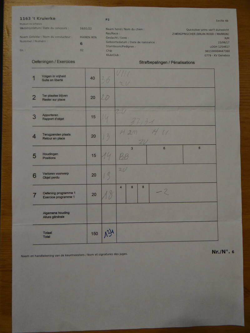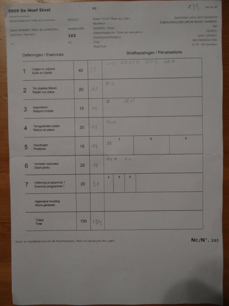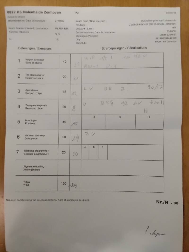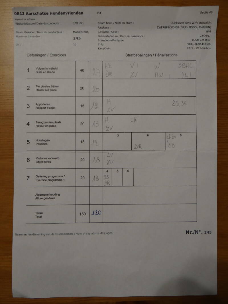 *For this competition in GP 2 at DS ''Education Canine les Cawets'' at Nasogne, Prins achieved a score of 120/150