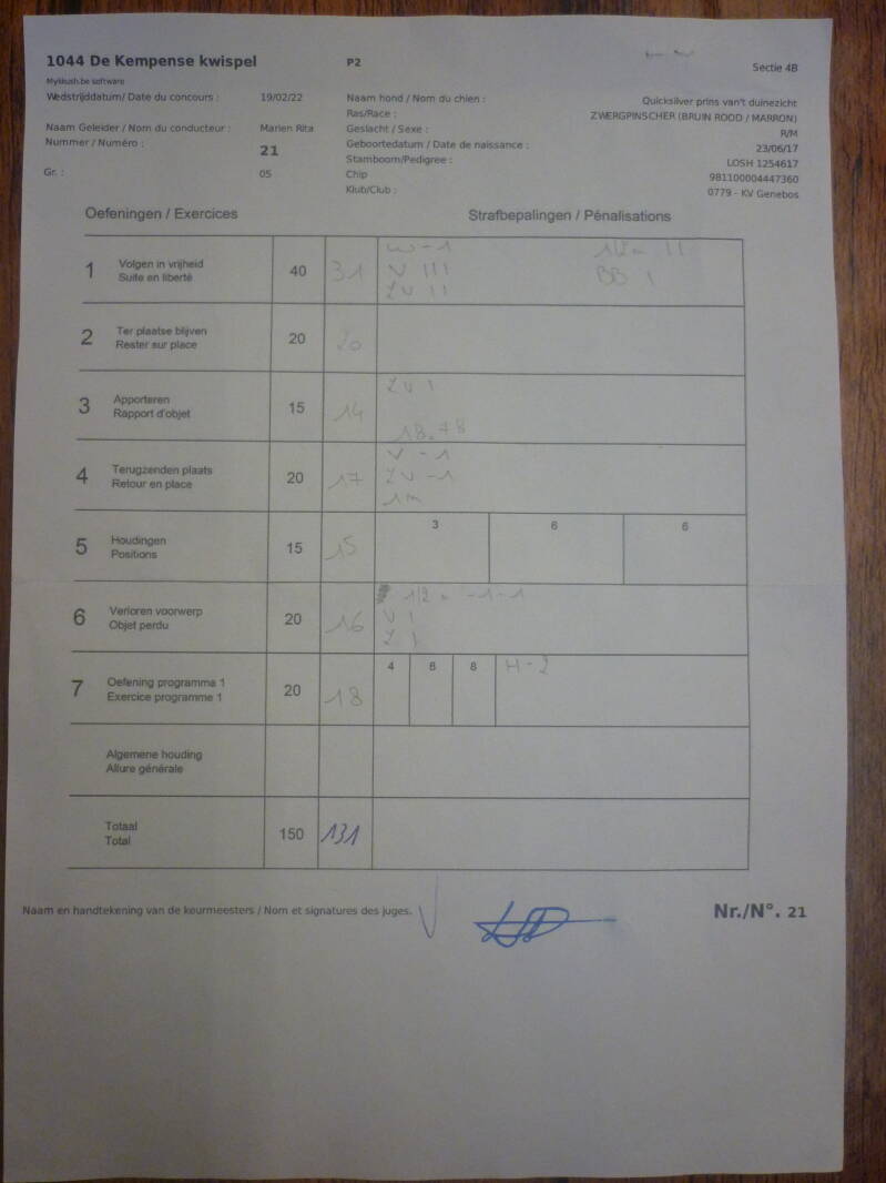 *For this competition in GP 2 at DS ''Glabbeekse Hondenschool'' at Glabbeek, Prins achieved a score of 131/150